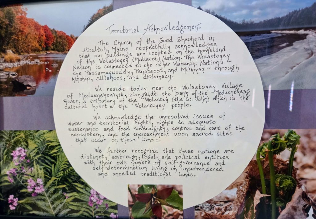 The Church of the Good Shepherd in Houlton, Maine respectfully acknowledges that our buildings are located on the homeland of the Wolastoqey (Maliseet) Nation. The Wolastoqey Nation is connected to the other Wabanaki Nations — the Passamaquoddy, Penobscot, and Mi’kmaq — through kinship, alliances and diplomacy. We reside today near the Wolastoqey village of Meduxnekewiyik, alongside the bank of the Meduxnekeag River, a tributary of the Wolastoq (the St. John) which is the cultural heart of the Wolastoqey people. We acknowledge the unresolved issues of water and territorial rights, rights to adequate sustenance and food sovereignty, control and care for the ecosystem, and the encroachment upon sacred sites that occur on these lands. We further recognize that these nations are distinct, sovereign, legal and political entities with their own powers of self-governance and self-determination living on unsurrendered and unceded traditional lands.
